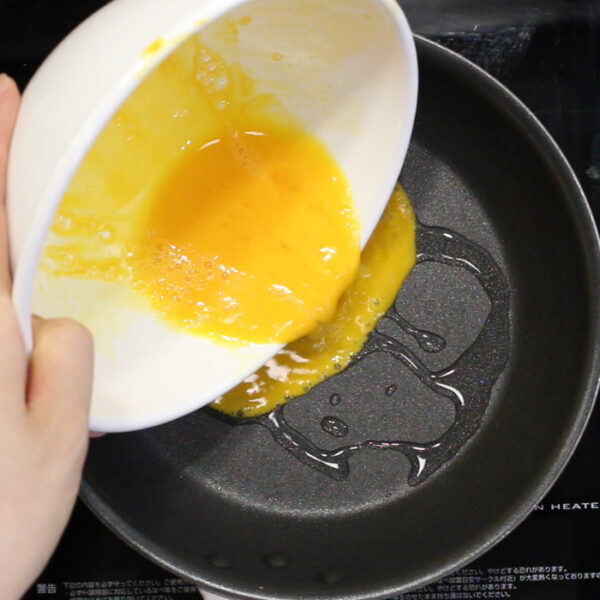 ボウルに卵を1個(1人分)入れかき混ぜ、熱したフライパンにサラダ油小さじ1を入れ強めの中火にして卵を入れる。