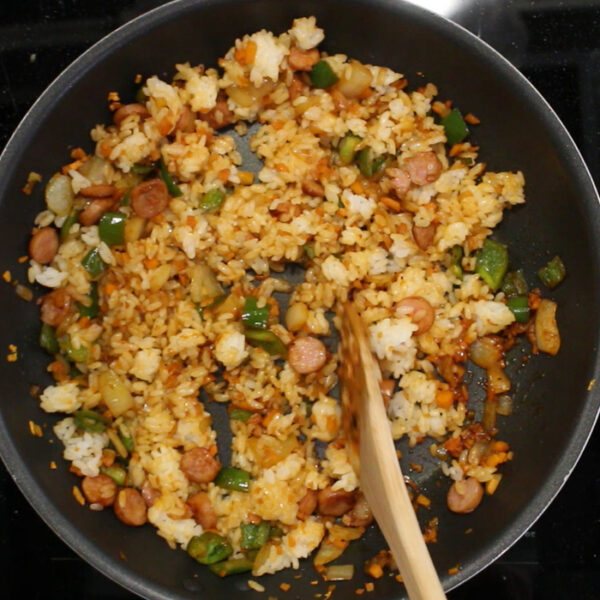 ・ご飯は保温でぱさついたものや、硬めに炊いたものを使うとケチャップライスがべたつきません。