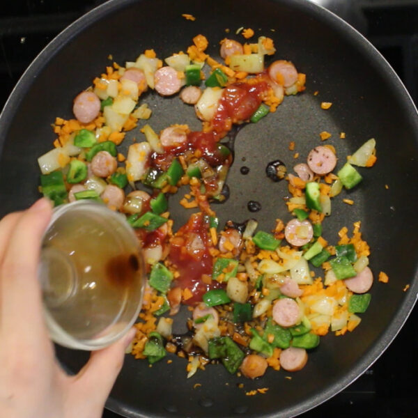 ピーマンとソーセージ、塩、胡椒を加え、全体に油が回ったらケチャップとウスターソースを入れて混ぜ、加熱しながら少し水分を飛ばす。