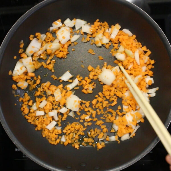 フライパンにオリーブ油、たまねぎ、にんじんを入れ、強めの中火でたまねぎが透き通るまで炒める。