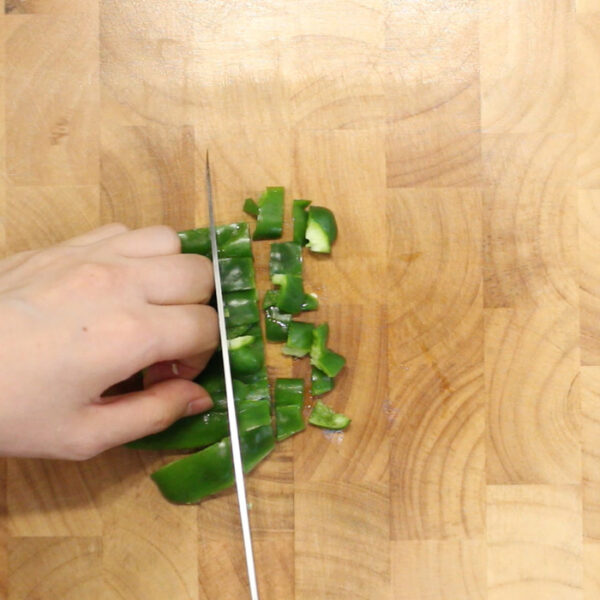 たまねぎ、ピーマンは5mm角切り、にんじんは皮ごとみじん切り、ソーセージは厚さ5mmに切る。
