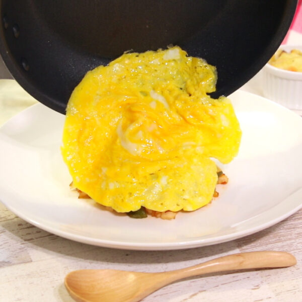 お箸で円を描くように手早く混ぜて火を止め、余熱で半熟になったら表向きのまま5の上にのせる。(もうひとつも同じように作る)