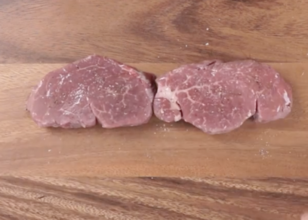 常温の牛肉に、両面に塩・胡椒をして、オリーブ油を塗る。