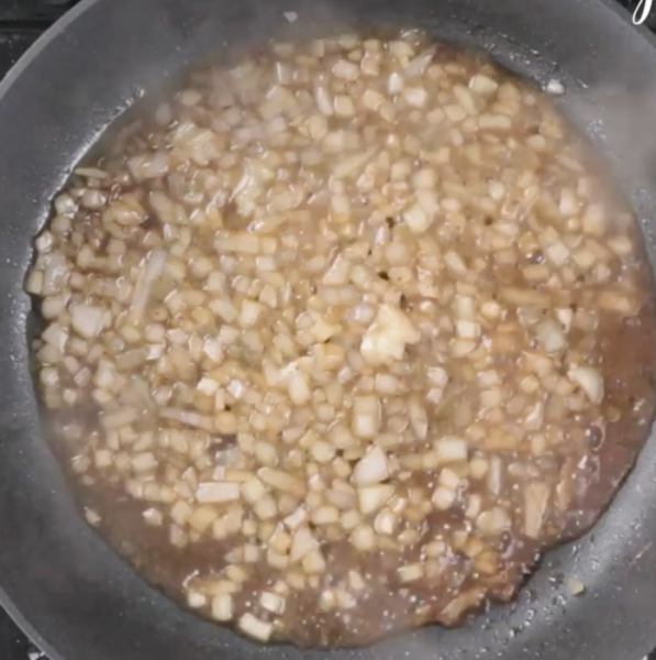 肉を焼いた後のフライパンでたまねぎを強火で炒め、和風ドレッシングを加えてひと煮立ちさせる。