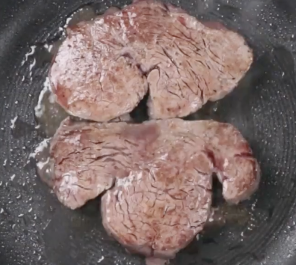 同じフライパンで1の牛肉を焼く。中火で表面をしっかり焼いた後、蓋をして弱火で火を通す。好みの焼き具合で皿に肉だけ取り出す。