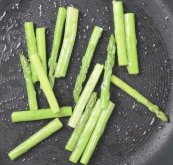 フライパンにオリーブ油を熱し、アスパラガスをさっと炒め、皿に移しておく。