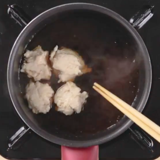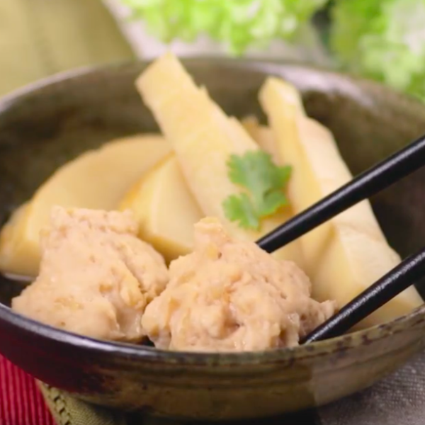 鍋にだし汁、Bを加えて煮立て、2を入れて中火で煮る。鶏団子が固まったら端に寄せ、1のたけのこを加えて、落とし蓋をして中火で15分ほど煮る。