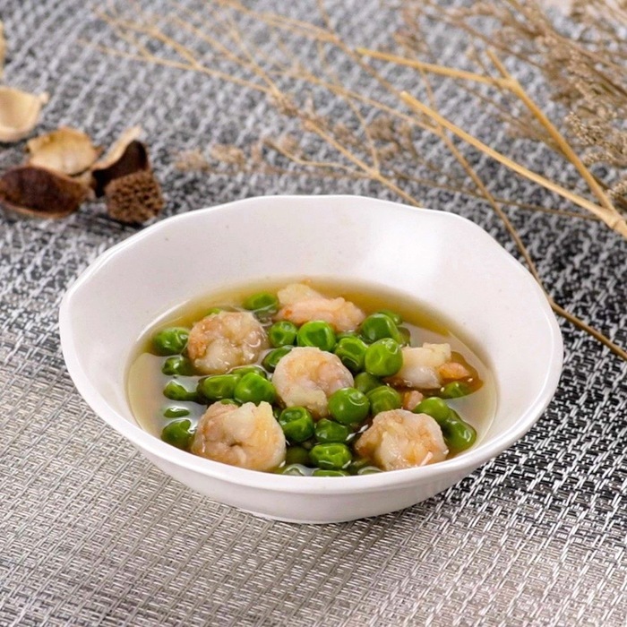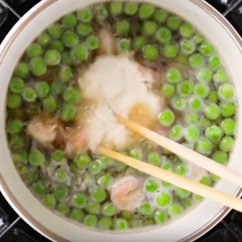 鍋にグリーンピース、だし汁、調味料を加えて2分程煮て、むき海老を加える。