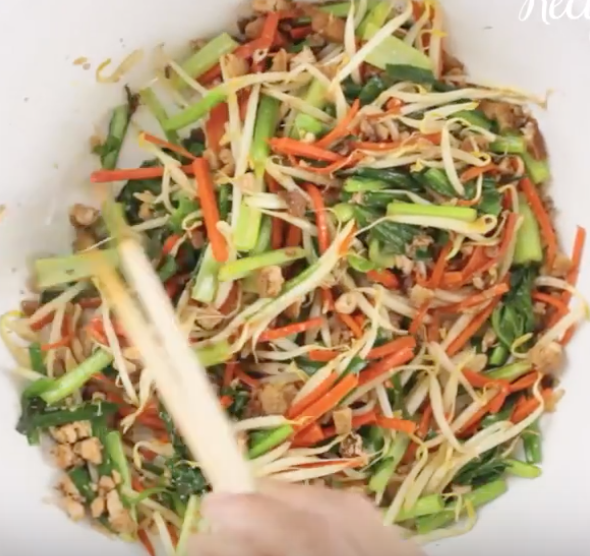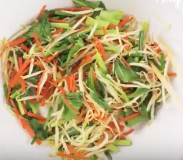 フライパンにごま油をひいてにんじんを炒めてから、もやし、小松菜、にらを加えて炒める。