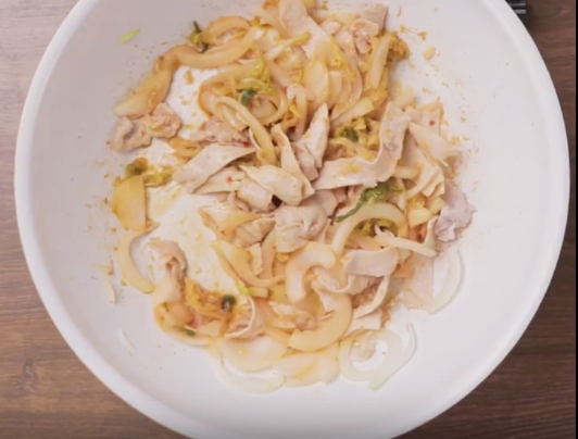 豚肉、キムチは食べやすい大きさに切る。たまねぎは、スライスする。