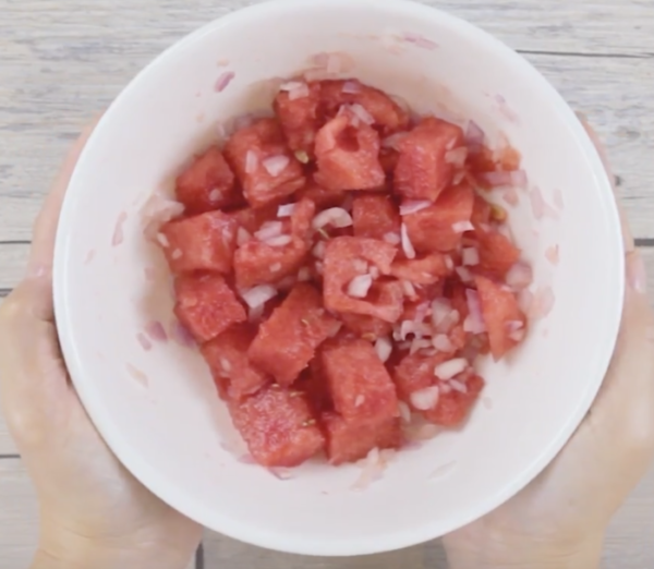 ボウルにスイカとたまねぎを入れ、塩で和える。