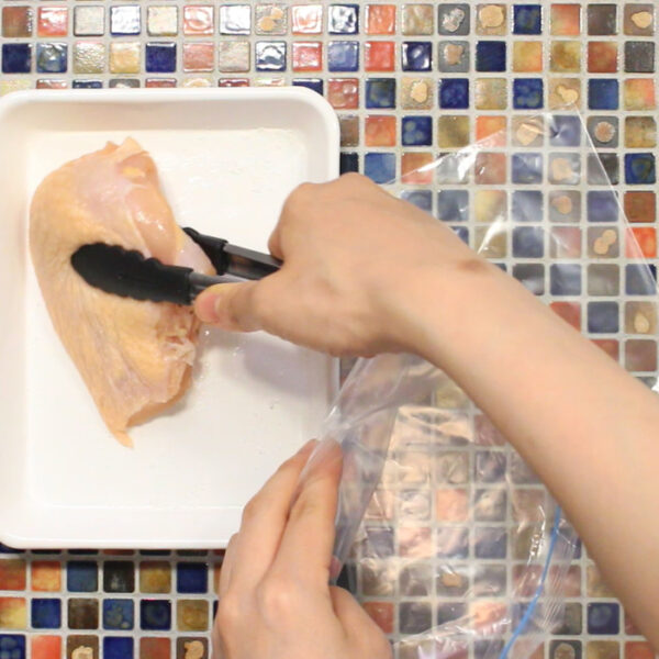 鶏むね肉に塩、砂糖をまぶし、ジッパー付きの保存袋に入れる。