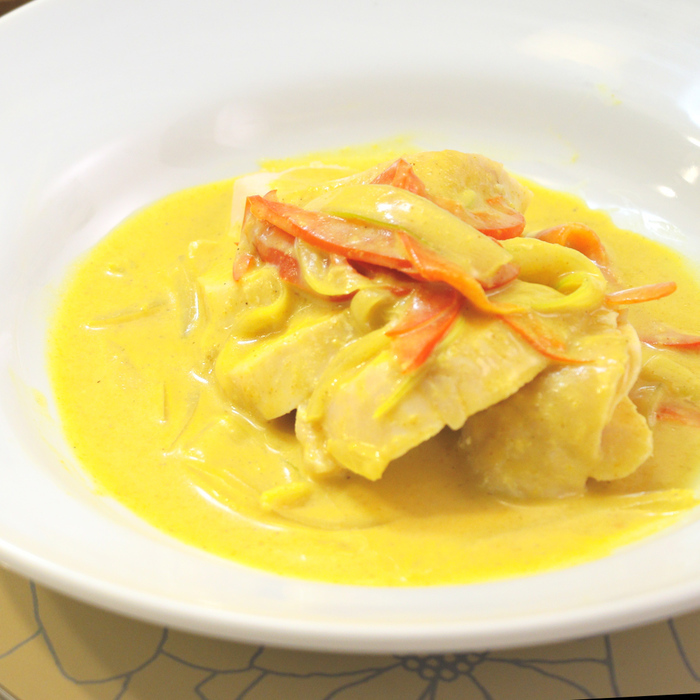 熱した鍋にバターを入れ、3を加えて炒め、薄力粉、カレー粉を振り入れてよく混ぜたら、牛乳を加えて煮詰め、塩で味を調える。