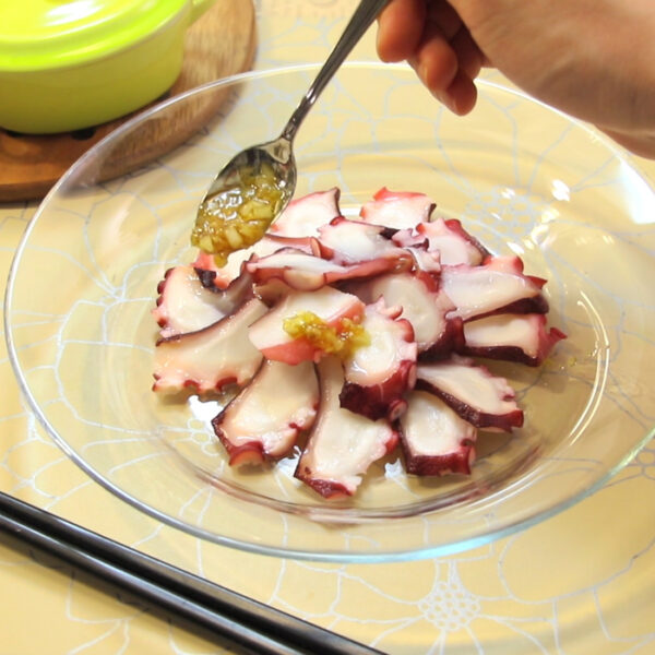 茹でタコを薄いそぎ切りにして、器に並べる。