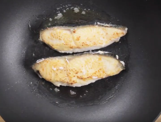 フライパンにバターをひき、タラの両面をこんがり焼き、皿に盛り付けて最後にソースをかけて完成。