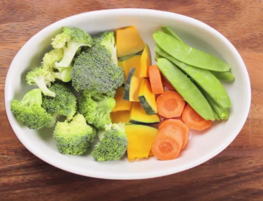 かぼちゃは半分または1/4の大きさのものを5mm幅に切る。にんじんは1cm程の輪切りにする。ブロッコリーは、一口サイズに房から分ける。絹さやは筋を取っておく。これらの野菜は全て電子レンジで蒸し加熱する。