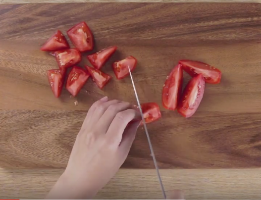 トマトはくし形に切り、それを半分に切る。ミニトマトは半分に切る。たまねぎはスライスして、水に軽くさらす。