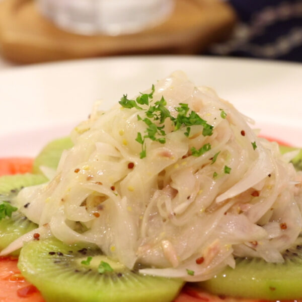 ・キウイフルーツを使った爽やかなサラダ。キウイフルーツの甘みとたまねぎの辛味がマッチしてマイルドな味わいです。