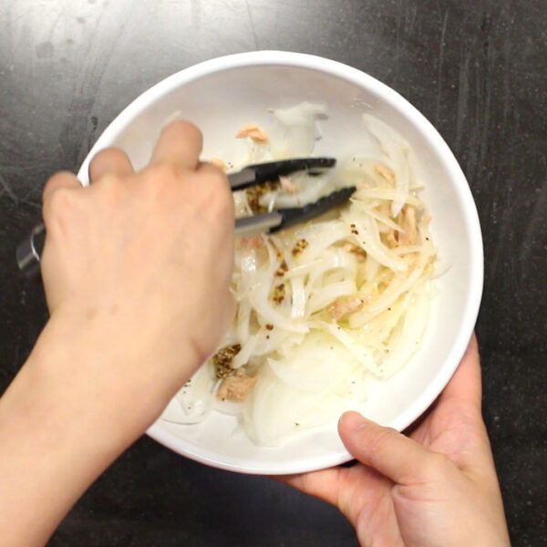 新たまねぎはスライサーで薄切りにし、ツナ缶、Aと和える。
