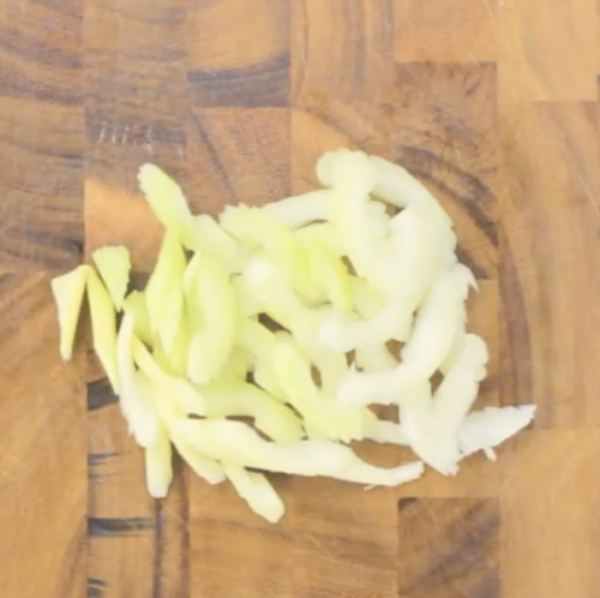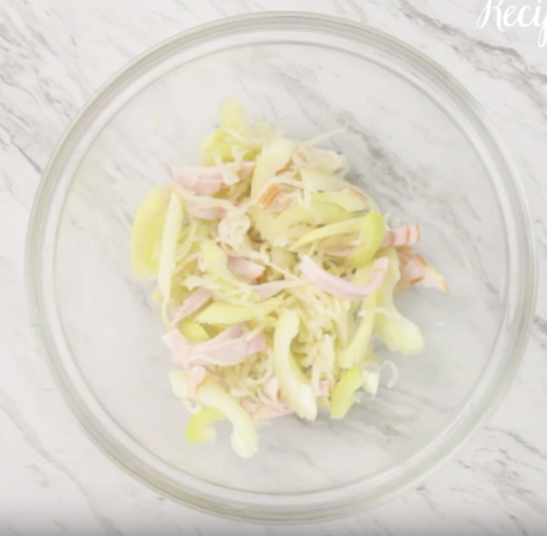 セロリは繊維を切るように、横または斜めで厚さ3mmに切る。ハムは半分に切って3mmに切る。それらを1に入れる。