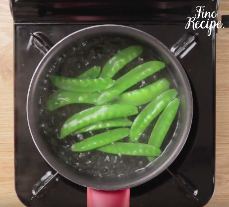 絹さやの筋を取り固めに茹で、かにかまはほぐしておく。