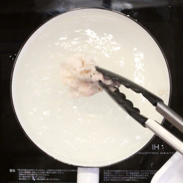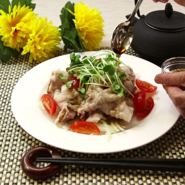 沸騰したお湯に豚肉を広げながら茹で、火が通ったら粗熱を取る。