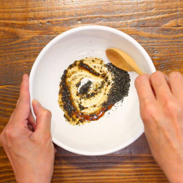 ボウルに黒すりごま、醤油、砂糖を入れてよく混ぜる。