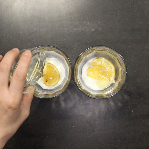 グラス2個それぞれに、ヨーグルト60g、2を20g程(レモンと汁合わせて)入れ、炭酸水を注ぐ。(ハニーレモンはお好み量を足し入れ、味を調整してください)