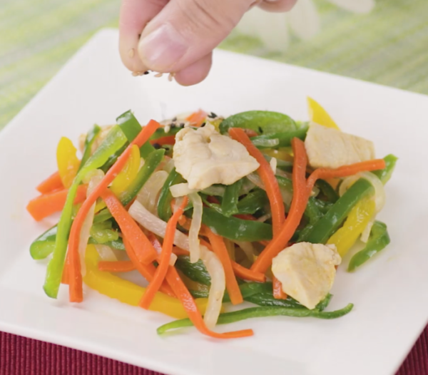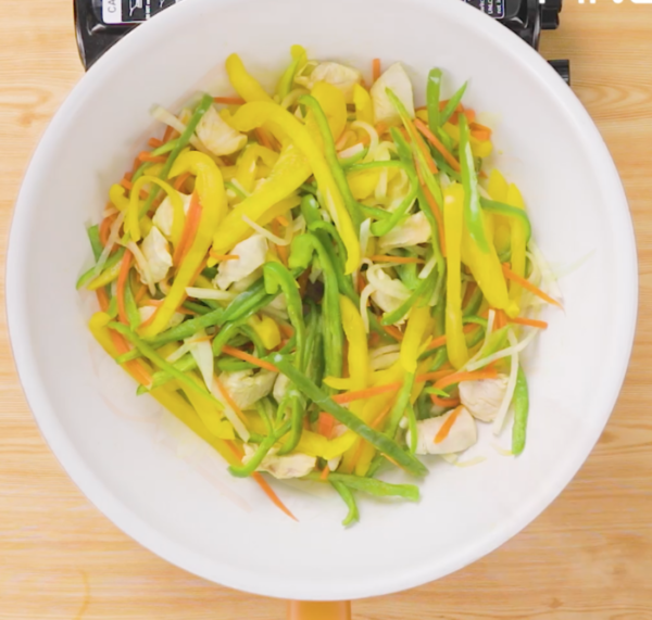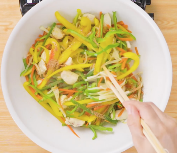 フライパンを中火にかけ、サラダ油を入れてささみ、にんじん、だいこん、黄パプリカ、ピーマンの順番で炒める。