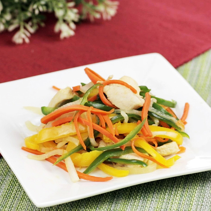 ・脂肪が少なくたんぱく質を含むささみを、だいこんやにんじん、ピーマンと一緒に炒めました。