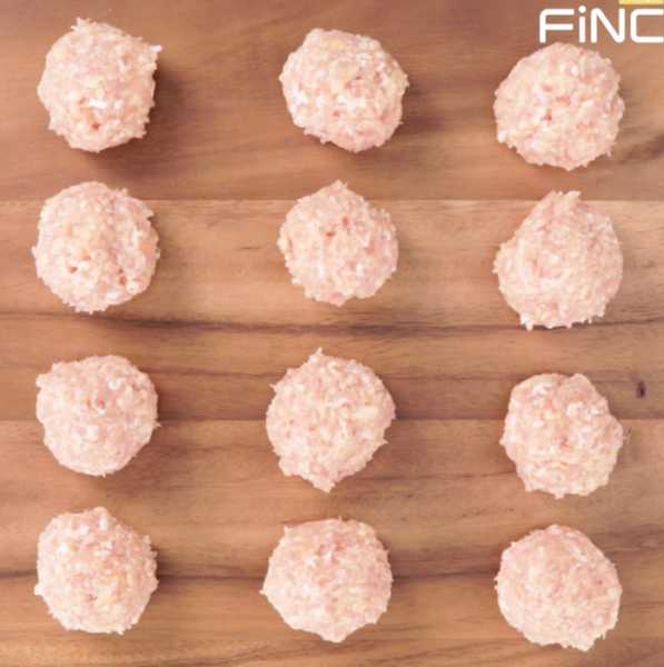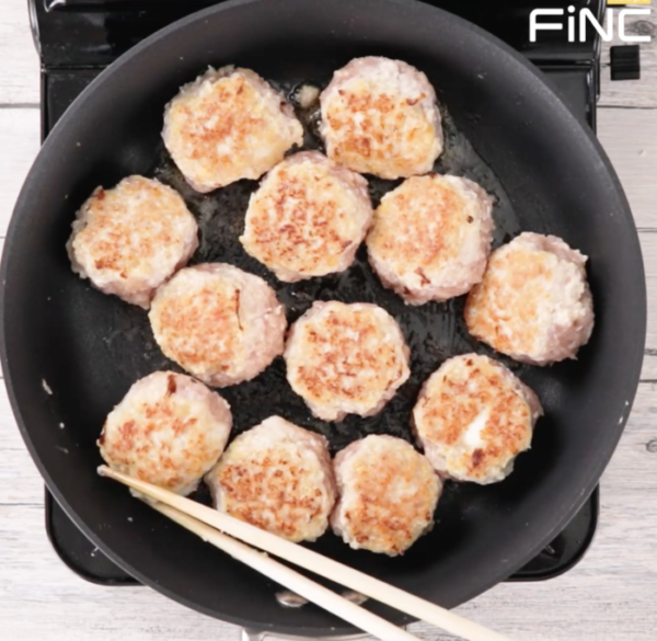 ・鶏ミンチのハンバーグの中に、うずらの卵を包みます。
