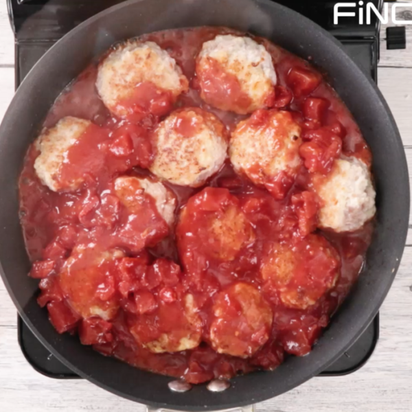 トマト水煮缶を3に加え、蓋をして約15分煮込む。