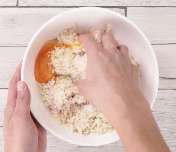 鶏むねひき肉をボウルに入れ、塩とパン粉、卵を入れてよく混ぜる。
