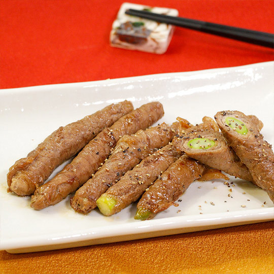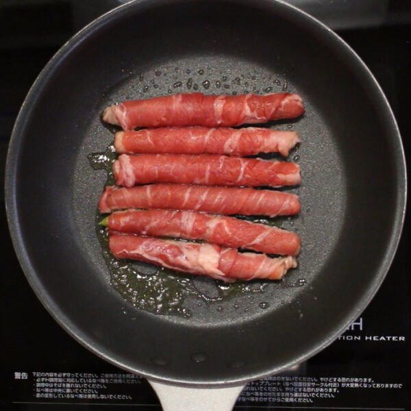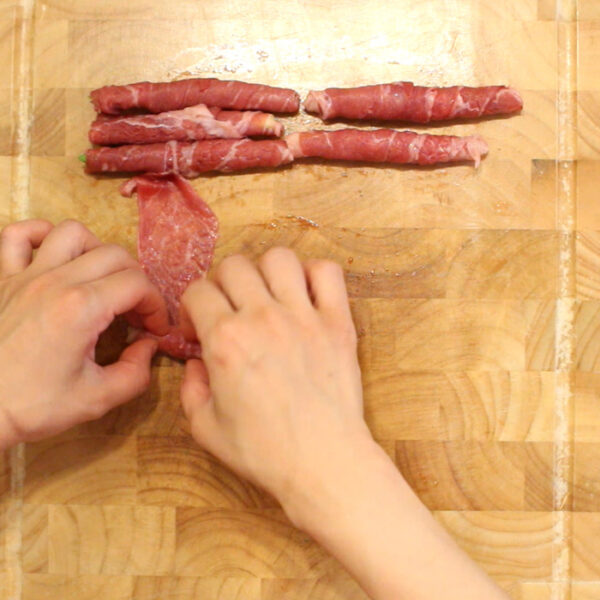 牛肉1枚を縦長に広げ、2をのせて巻く。これを全部で6本作る。