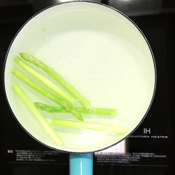 アスパラガスは根の固い部分は皮むき器で剥いて、長さを半分に切る。