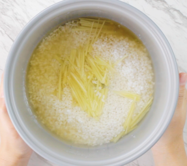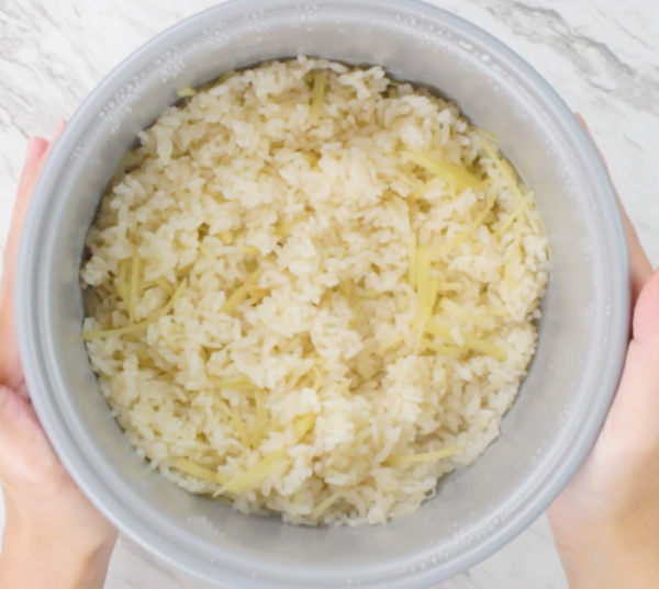 炊飯器に1、A、千切りにしたしょうがを入れ、1.5合目盛りまで水を加えて炊飯する。
