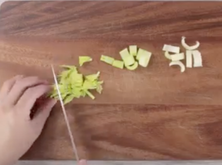 セロリは根元、茎、葉にわけ食べやすい大きさに切る。