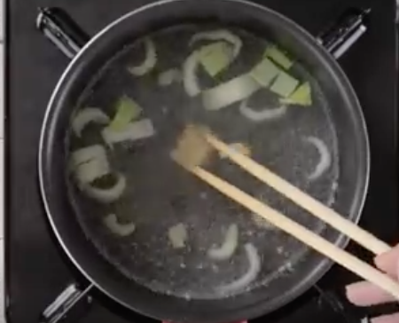 鍋に水を入れ沸騰したら塩、1の根本と茎、野菜ブイヨンを加え煮る。