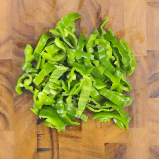 にんじんは薄く短冊切り、ピーマンは縦半分に切って種を抜き、幅5mmの縦切りにする。