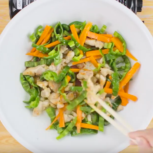 にんじんとピーマンを加えて混ぜ、全体に油が回ったらAを入れ、全体に絡めるように炒めて火を止める。