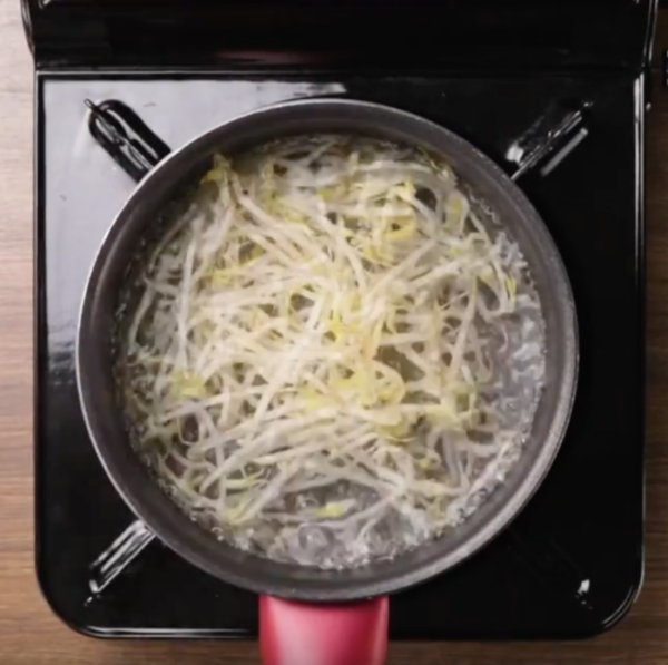 もやしは沸騰したお湯で茹で、ザルにあげて水で冷やし、水をよく切る。