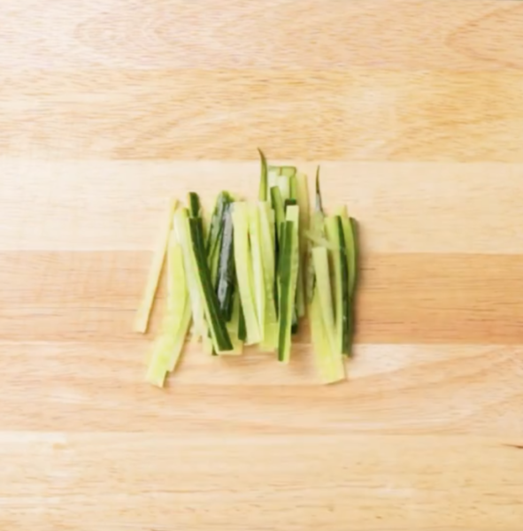 きゅうりを3mm幅程度の細切りに、水菜、ロースハムをきゅうりと同程度の太さ、長さに切る。