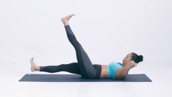 女性は特に気になる下腹を鍛えるトレーニングです。腰が床から離れてしまうと腰を痛める恐れがあるので、お腹にしっかりと力を入れ、床と身体にスペースができないように行いましょう。