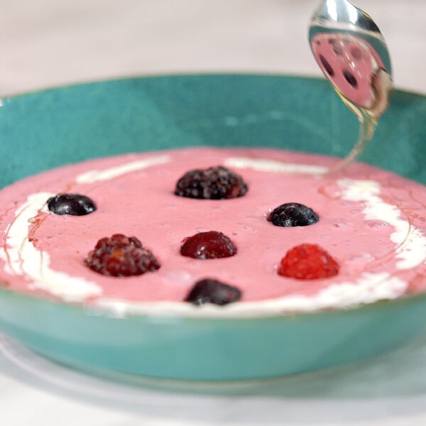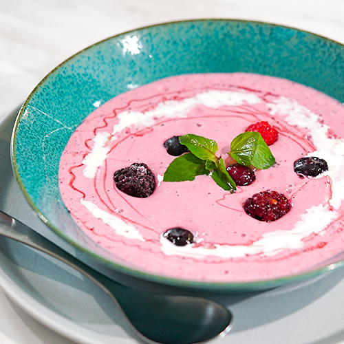 器に注ぎミックスベリーとセルフィーユを飾り、はちみつ、生クリームをトッピングしたら出来上がり。