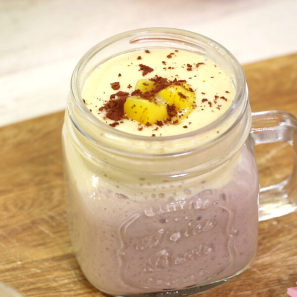 グラスに2、3を半量ずつ注ぎ、取っておいたマンゴーを飾る。仕上げにココアパウダーをふりかけ完成。
