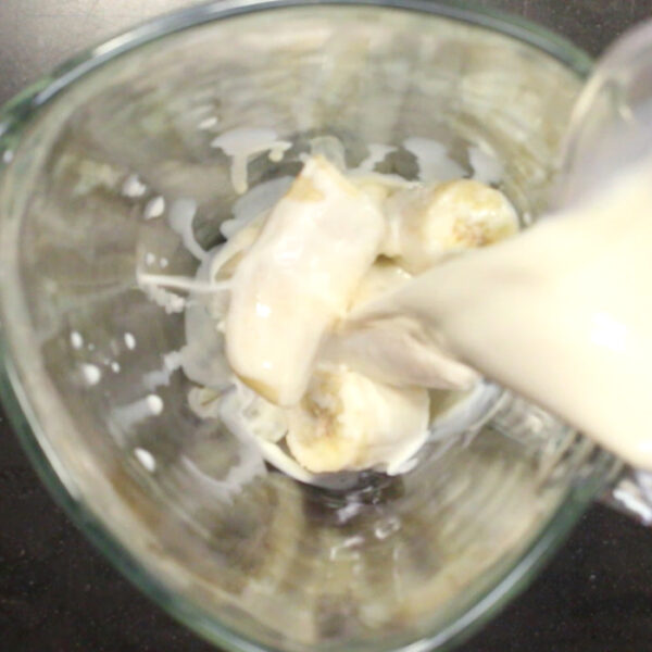 1のバナナと豆乳(200ml)をミキサーにかけ、グラスに注ぐ。
