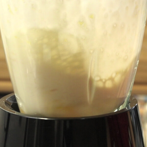 冷凍カットマンゴーと豆乳(100ml)をミキサーにかける。マンゴーは飾り用に少量取っておく。