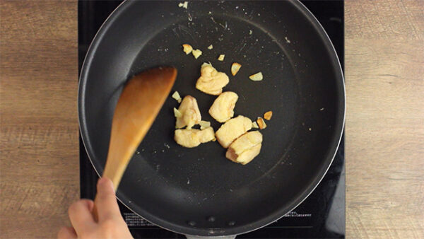 フライパンにオリーブオイルとにんにくを入れて、にんにくを焦がさないように炒める。鶏むね肉の両面を焼く。