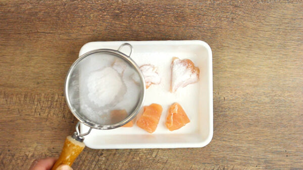 にんにくは薄切りにし、ミニトマトはヘタを取る。鶏むね肉を一口大に切り、片栗粉をまぶす。
