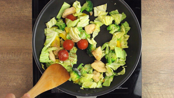 ミニトマト、塩、顆粒ブイヨンを入れて全体をざっと混ぜ合わせたら蓋をして3分ほど蒸し焼きにする。